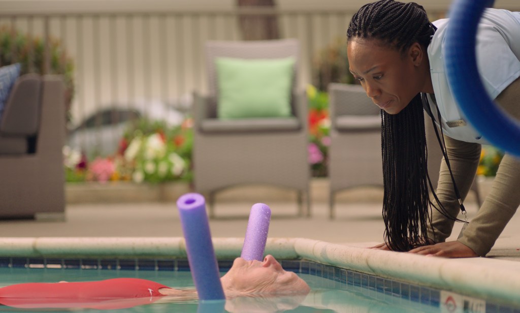 La sobriété des images et leur élégance est indéniable. Les plans posés, l’éclairage doux et la chaleur des couleurs créent une atmosphère immersive et enveloppante. Friedland adopte une approche sensuelle et sensorielle, privilégiant les gestes, les textures, les sons du quotidien, une façon de représenter la perte de mémoire sans drama, en laissant place à ce qui perdure (le toucher, les sensations, la mémoire du corps). La scène de la piscine où Ruth s’abandonne aux mains du soignant est pleine de grâce. On devine ses pensées avant même de l’entendre évoquer son bien être.